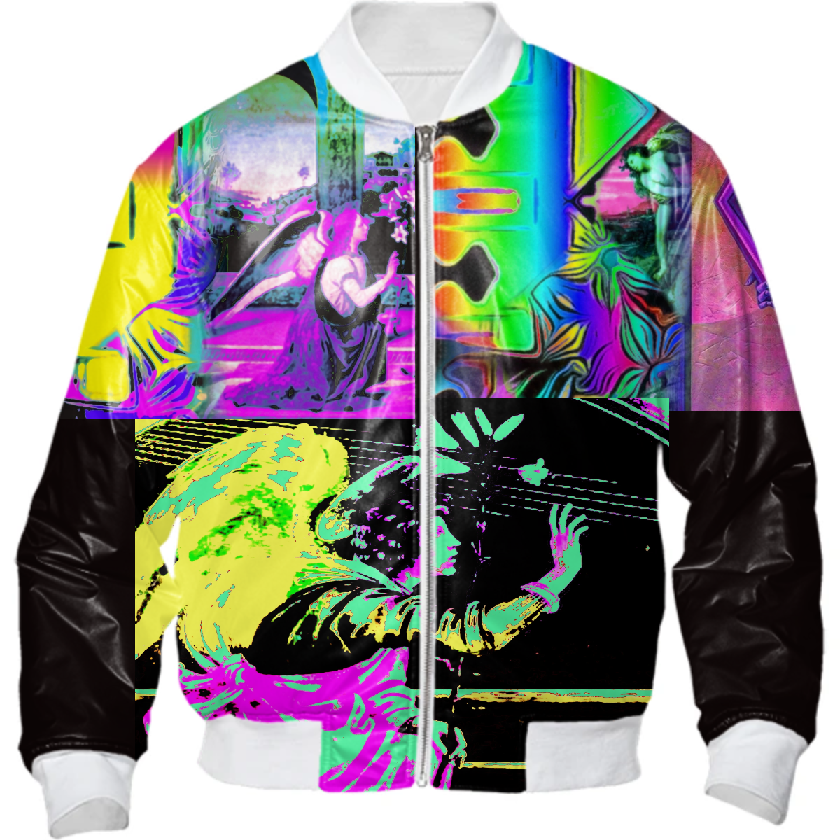 Light weight bombr jacket with your choice of white or black ribbing slight padding zip up front and side pockets. The inside is adorned with PAOM straps for swinging over your shoulders so you dont have to hold it.