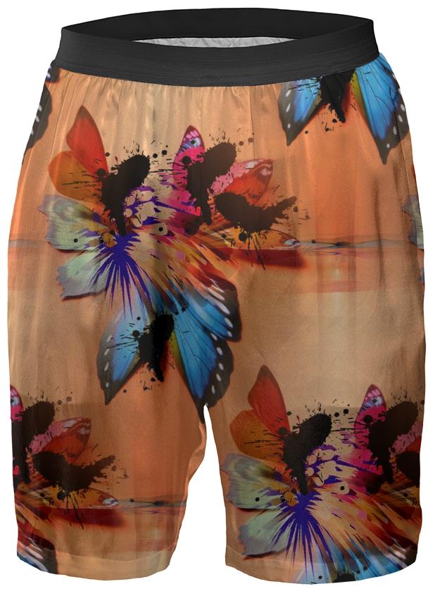 Loose fit silk boxers with elastic waistband buttoned front fly side seam pockets and one buttoned back pocket.