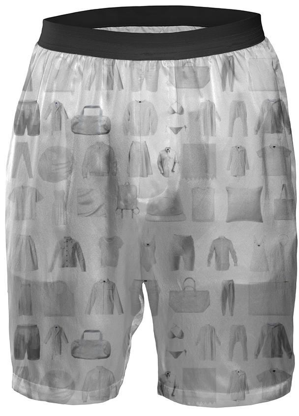 Loose fit silk boxers with elastic waistband buttoned front fly side seam pockets and one buttoned back pocket.