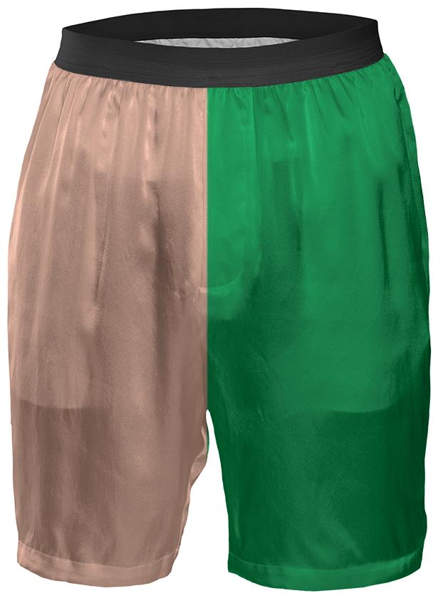 Loose fit silk boxers with elastic waistband buttoned front fly side seam pockets and one buttoned back pocket.