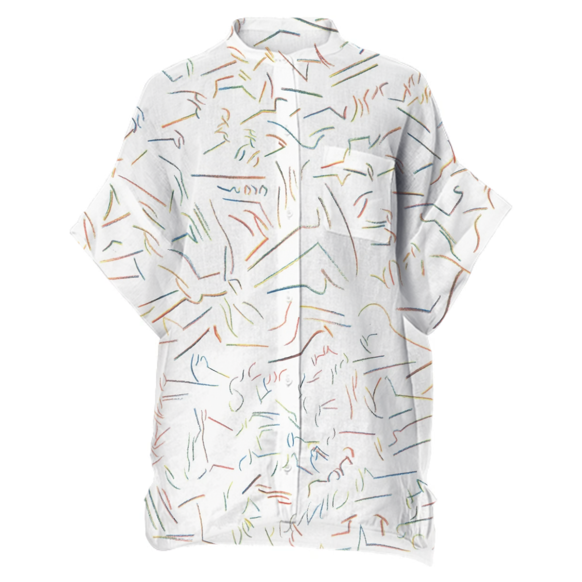 Unisex loose fit boxy linen shirt with front left side pocket. Mandarin collar with plastic buttons down the front.