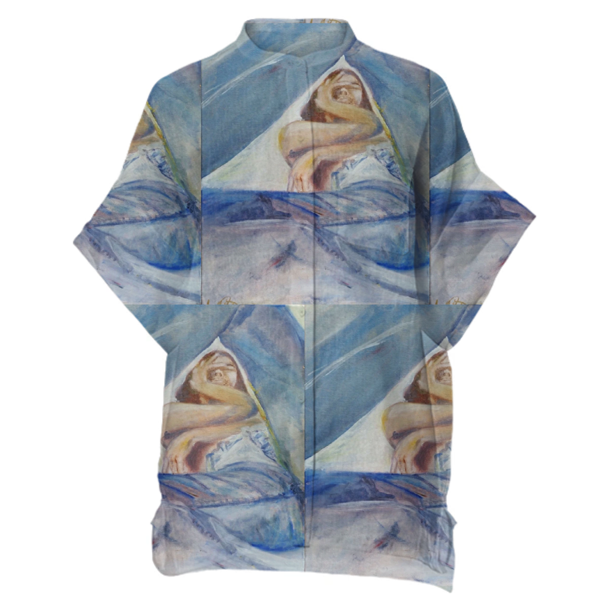 Unisex loose fit boxy linen shirt with front left side pocket. Mandarin collar with plastic buttons down the front.