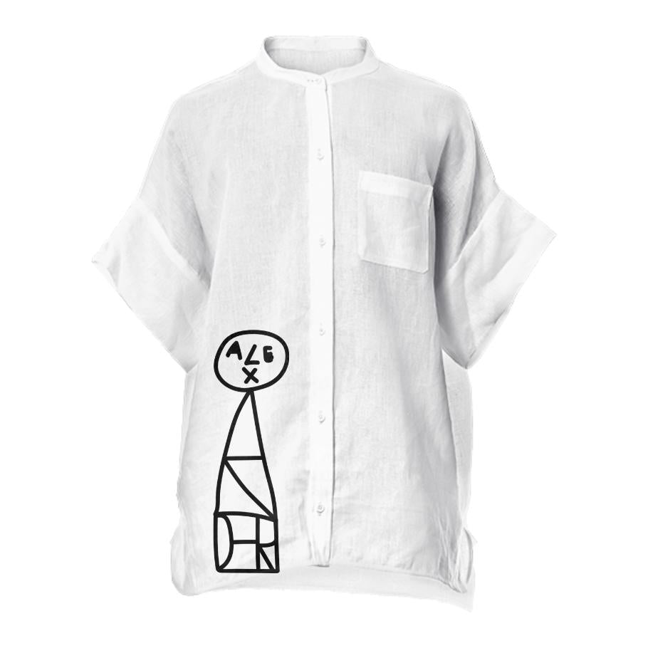 Unisex loose fit boxy linen shirt with front left side pocket. Mandarin collar with plastic buttons down the front.