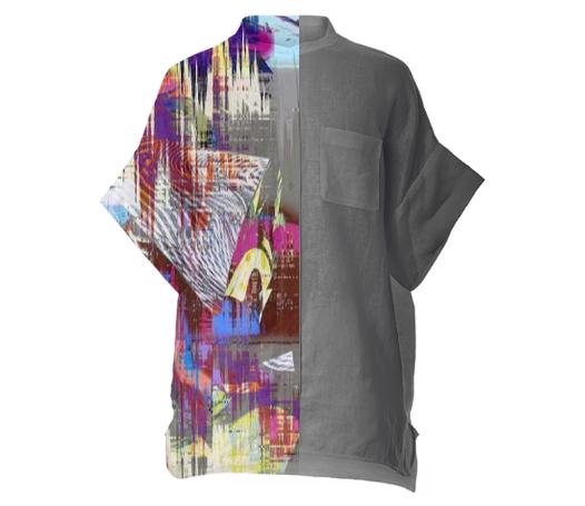 Unisex loose fit boxy linen shirt with front left side pocket. Mandarin collar with plastic buttons down the front.