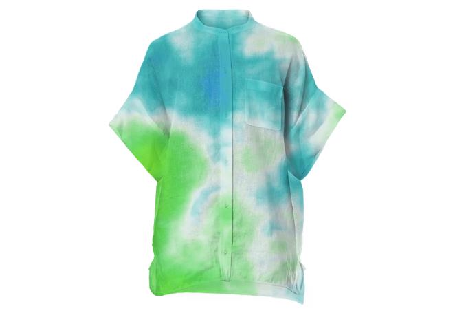 Unisex loose fit boxy linen shirt with front left side pocket. Mandarin collar with plastic buttons down the front.