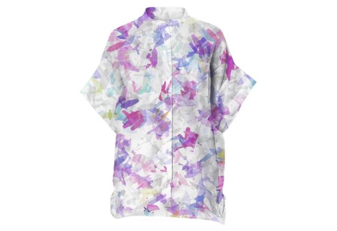 Unisex loose fit boxy linen shirt with front left side pocket. Mandarin collar with plastic buttons down the front.