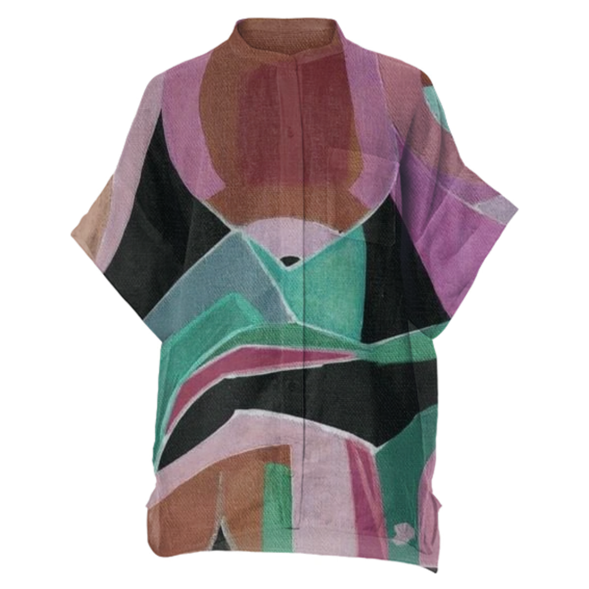 Unisex loose fit boxy linen shirt with front left side pocket. Mandarin collar with plastic buttons down the front.