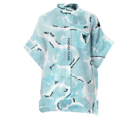 Unisex loose fit boxy linen shirt with front left side pocket. Mandarin collar with plastic buttons down the front.
