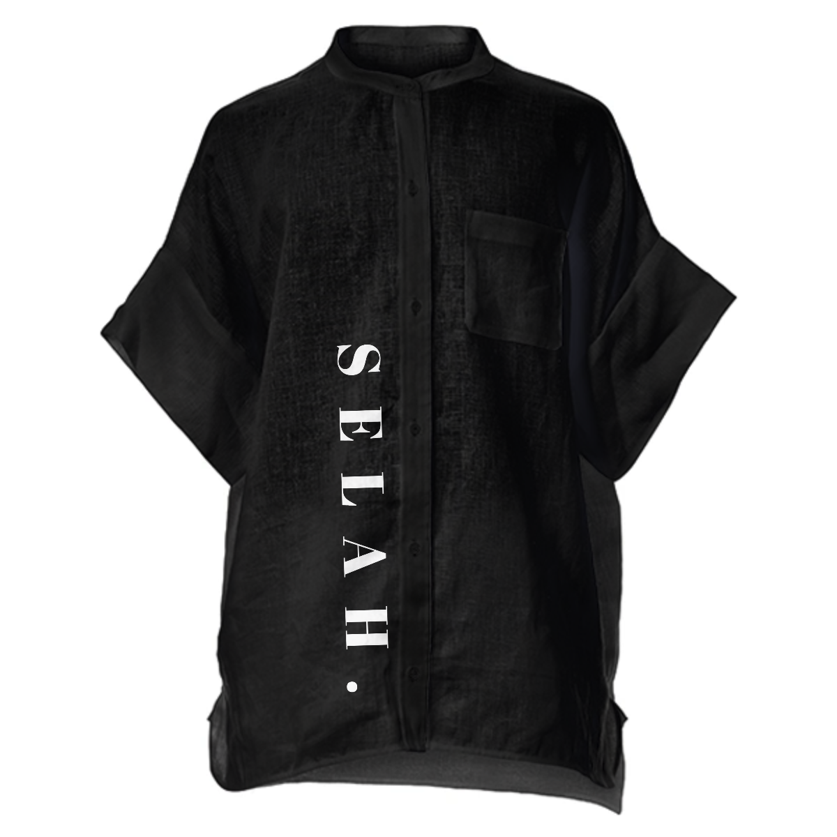Unisex loose fit boxy linen shirt with front left side pocket. Mandarin collar with plastic buttons down the front.