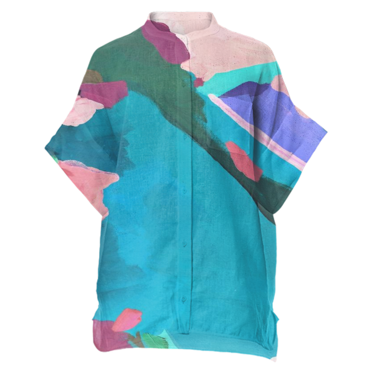 Unisex loose fit boxy linen shirt with front left side pocket. Mandarin collar with plastic buttons down the front.