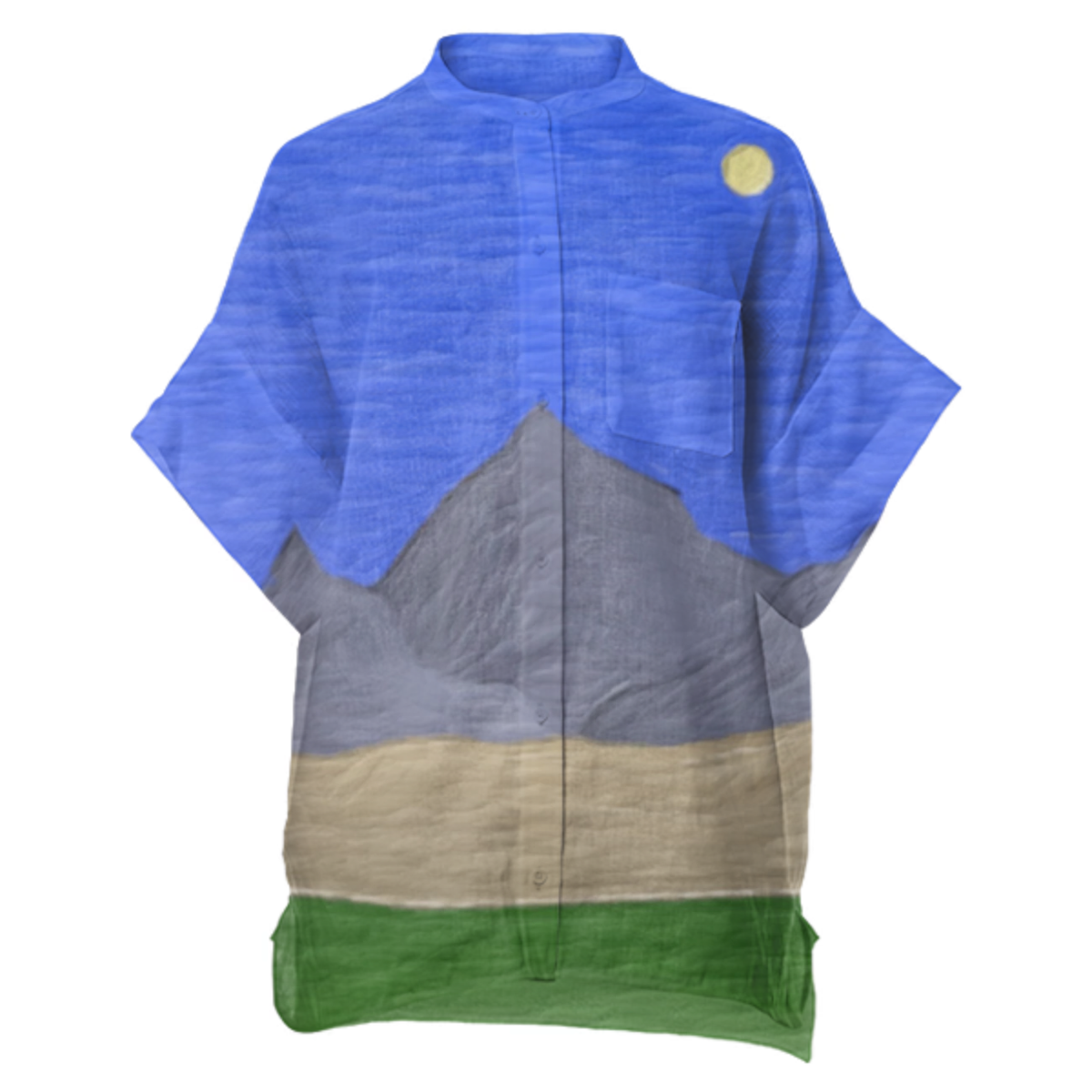 Unisex loose fit boxy linen shirt with front left side pocket. Mandarin collar with plastic buttons down the front.