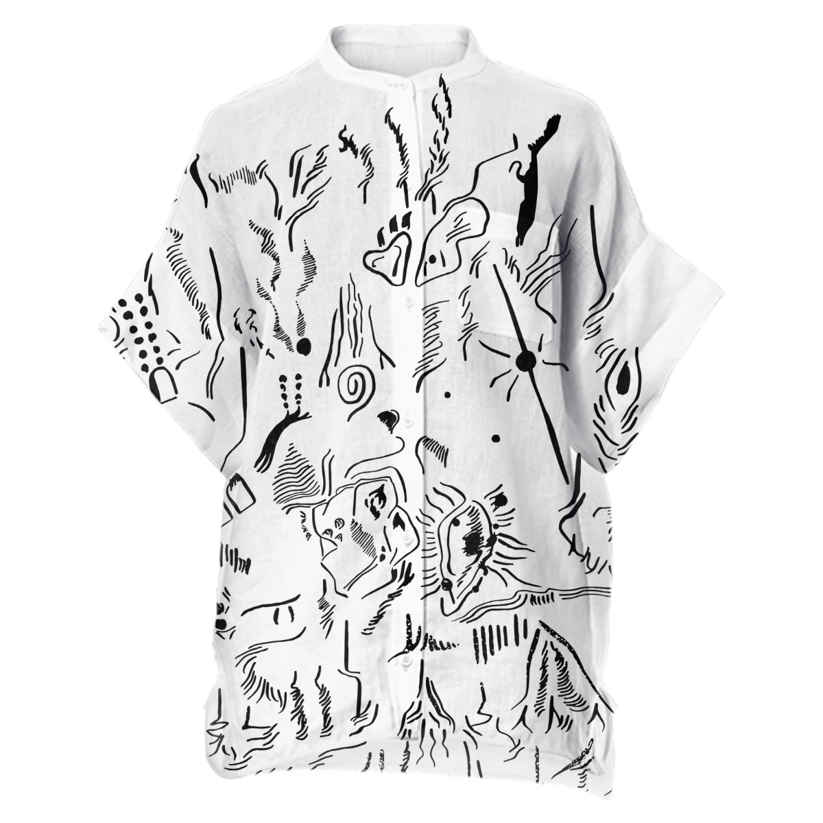Unisex loose fit boxy linen shirt with front left side pocket. Mandarin collar with plastic buttons down the front.