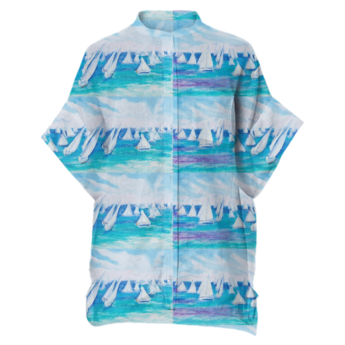 Unisex loose fit boxy linen shirt with front left side pocket. Mandarin collar with plastic buttons down the front.