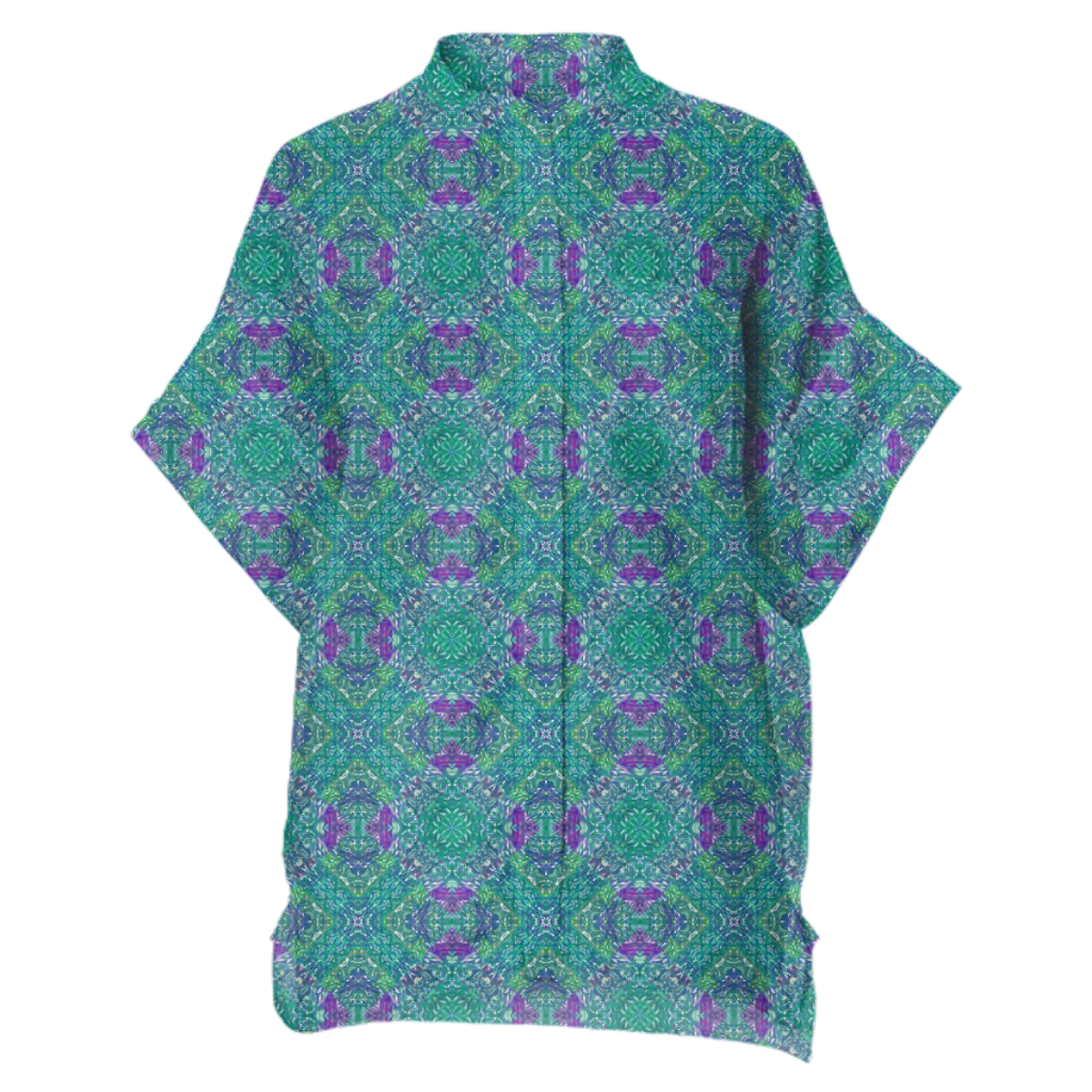 Unisex loose fit boxy linen shirt with front left side pocket. Mandarin collar with plastic buttons down the front.