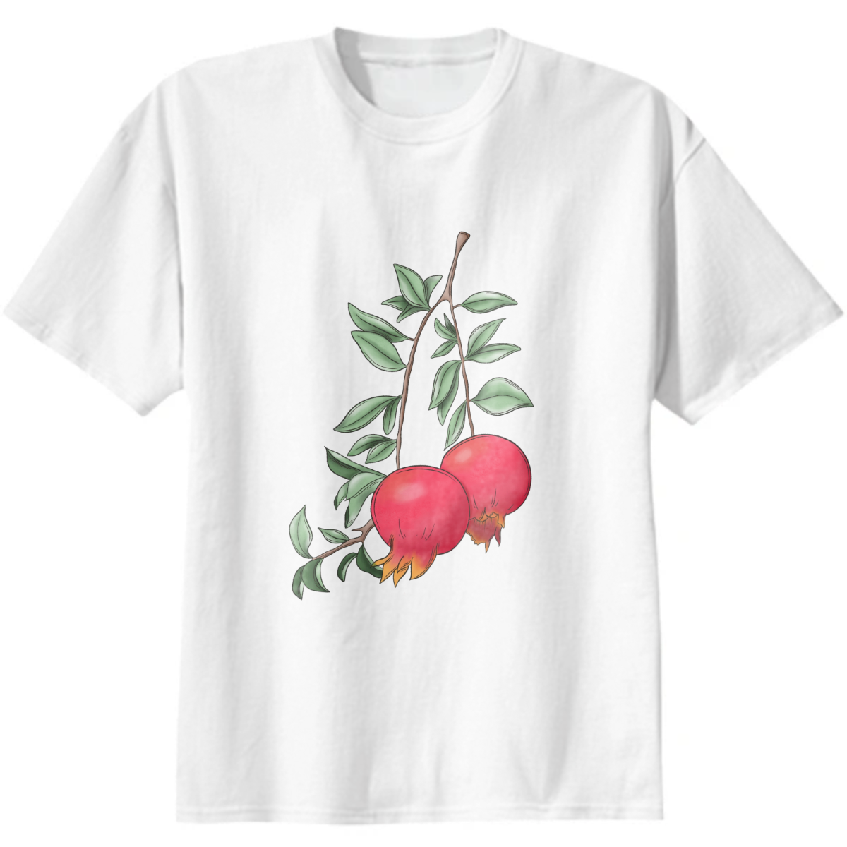 Pomegranate fruits on branch with leaves hand drawn illustration. Ripe tropical exotic fruit.