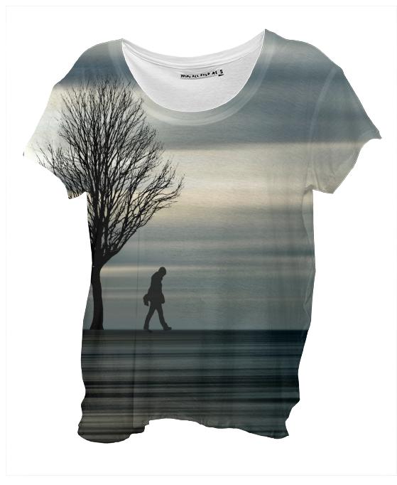 Loose fitting scoop neck shirt with nice drape and curved bottom hem.