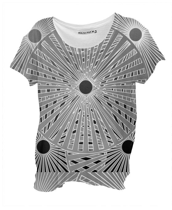Loose fitting scoop neck shirt with nice drape and curved bottom hem.