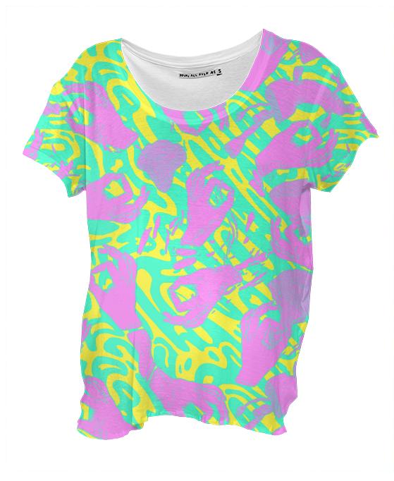 Loose fitting scoop neck shirt with nice drape and curved bottom hem.