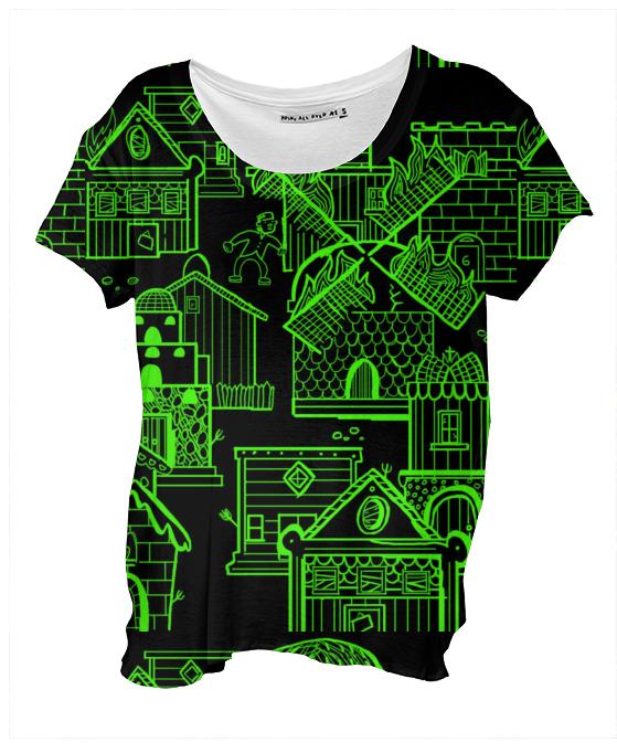 Loose fitting scoop neck shirt with nice drape and curved bottom hem.
