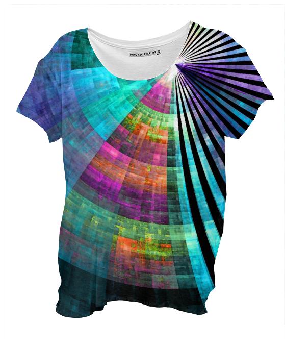 Loose fitting scoop neck shirt with nice drape and curved bottom hem.