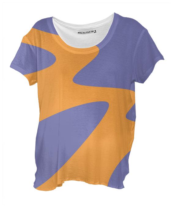 Loose fitting scoop neck shirt with nice drape and curved bottom hem.