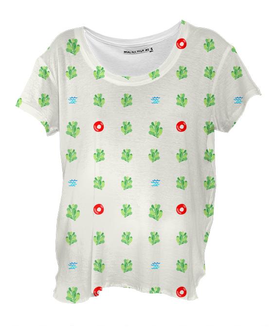 Loose fitting scoop neck shirt with nice drape and curved bottom hem.