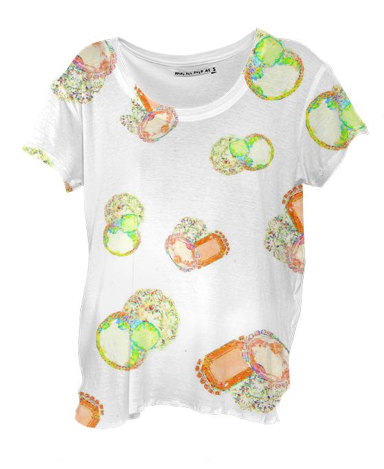 Loose fitting scoop neck shirt with nice drape and curved bottom hem.