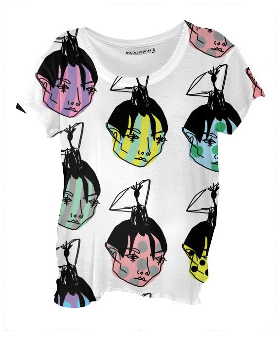 Loose fitting scoop neck shirt with nice drape and curved bottom hem.