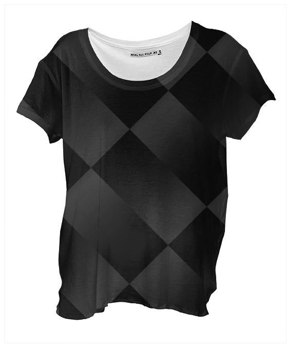 Loose fitting scoop neck shirt with nice drape and curved bottom hem.