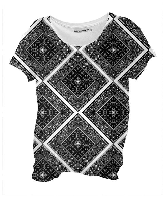 Loose fitting scoop neck shirt with nice drape and curved bottom hem.