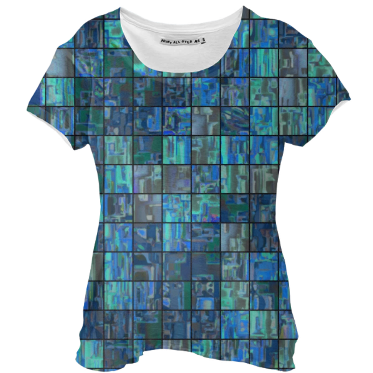 Loose fitting scoop neck shirt with nice drape and curved bottom hem.