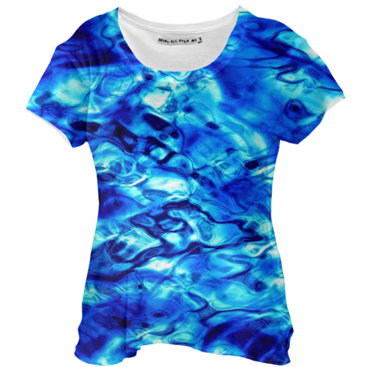 Loose fitting scoop neck shirt with nice drape and curved bottom hem.