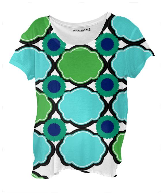 Loose fitting scoop neck shirt with nice drape and curved bottom hem.