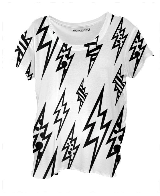 Loose fitting scoop neck shirt with nice drape and curved bottom hem.