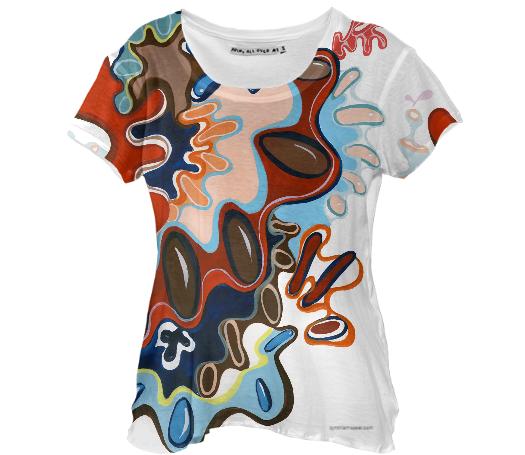 Loose fitting scoop neck shirt with nice drape and curved bottom hem.