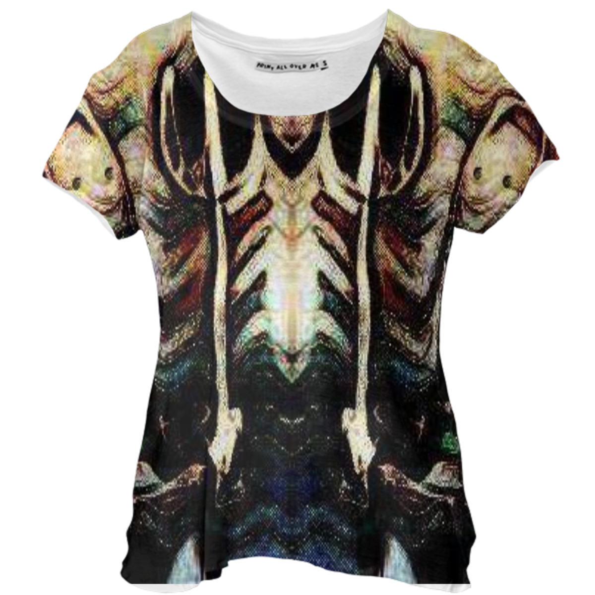 Loose fitting scoop neck shirt with nice drape and curved bottom hem.