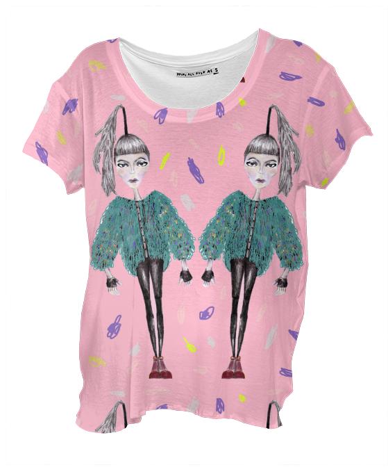 Loose fitting scoop neck shirt with nice drape and curved bottom hem.