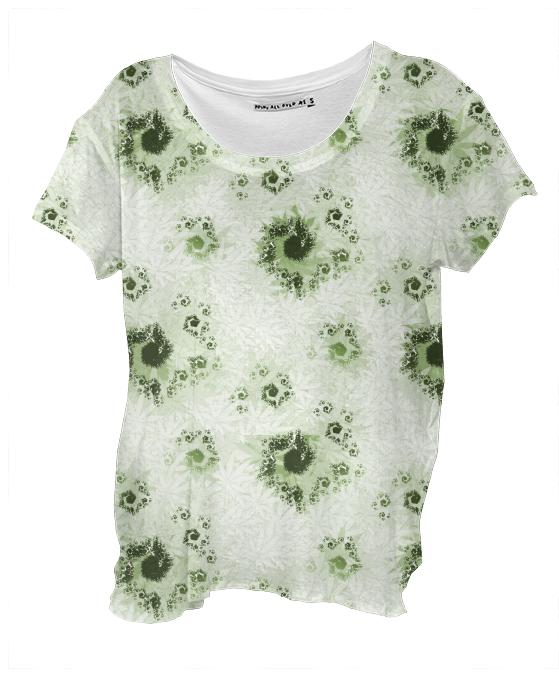 Loose fitting scoop neck shirt with nice drape and curved bottom hem.