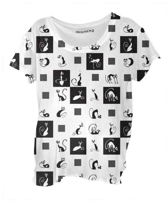 Loose fitting scoop neck shirt with nice drape and curved bottom hem.