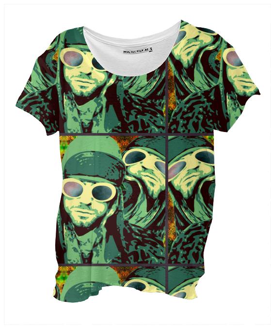 Loose fitting scoop neck shirt with nice drape and curved bottom hem.