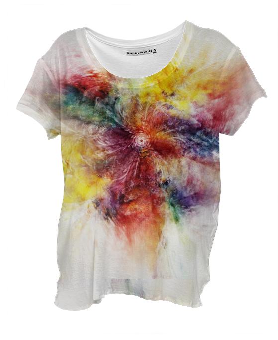 Loose fitting scoop neck shirt with nice drape and curved bottom hem.