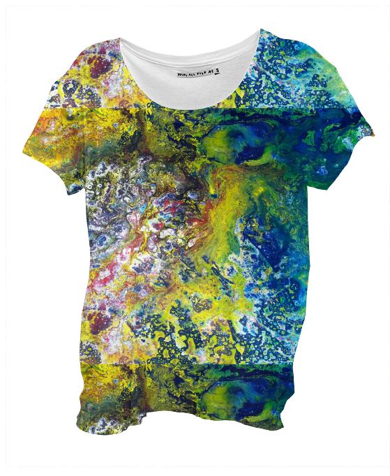 Loose fitting scoop neck shirt with nice drape and curved bottom hem.