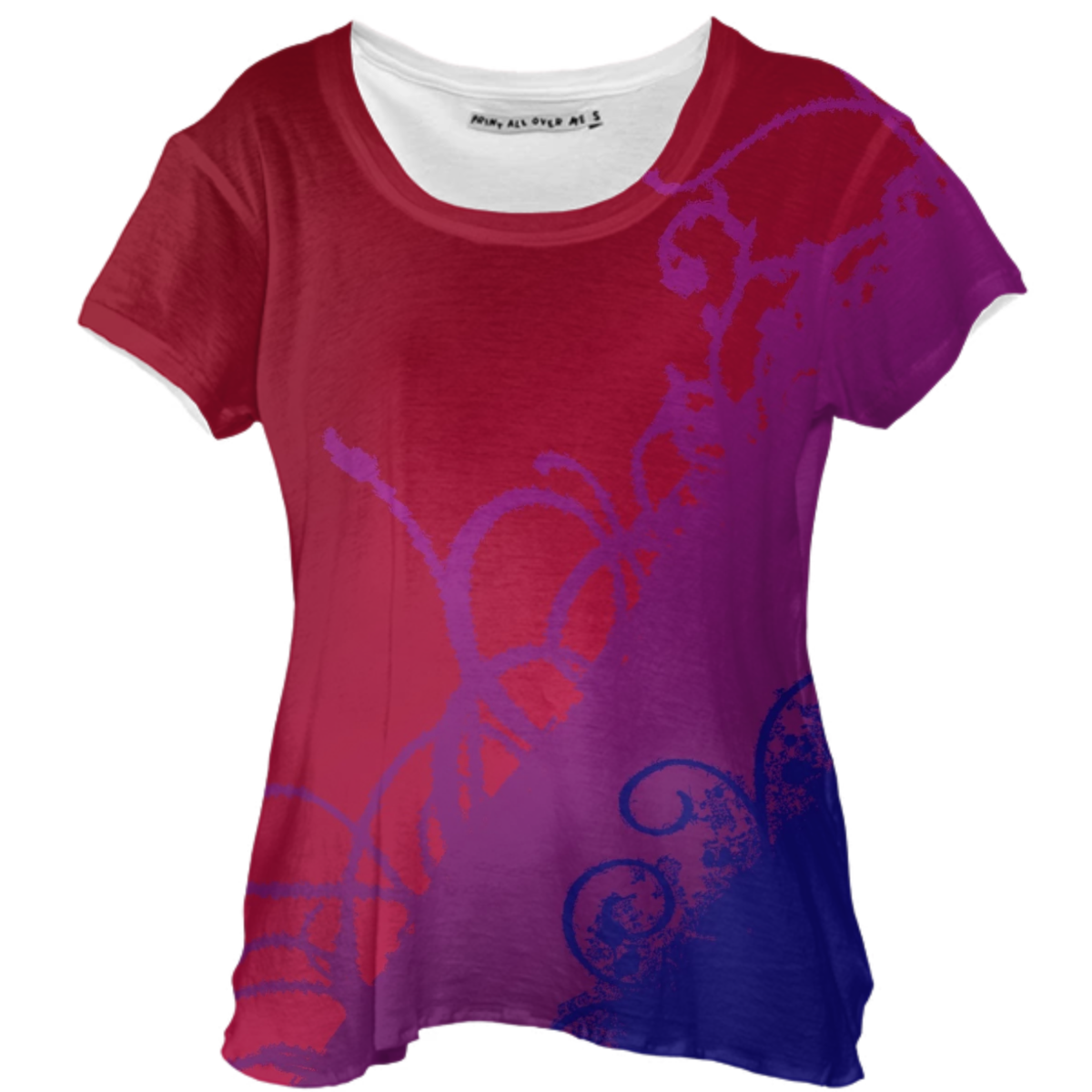 Loose fitting scoop neck shirt with nice drape and curved bottom hem.