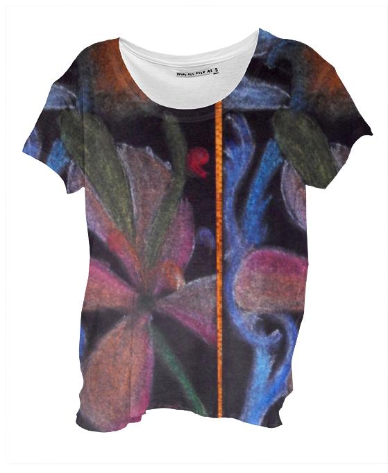 Loose fitting scoop neck shirt with nice drape and curved bottom hem.