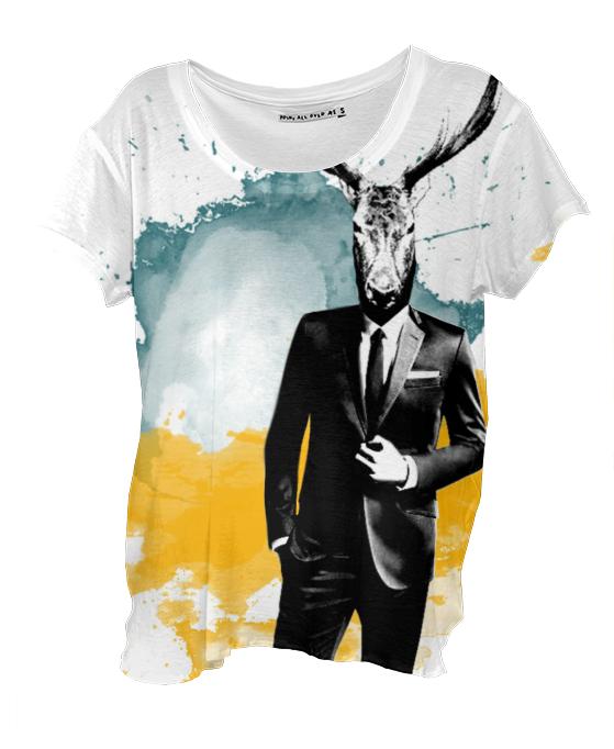 Loose fitting scoop neck shirt with nice drape and curved bottom hem.