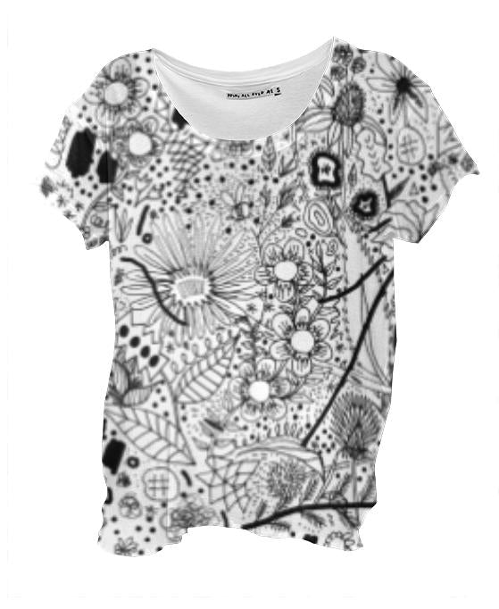 Loose fitting scoop neck shirt with nice drape and curved bottom hem.