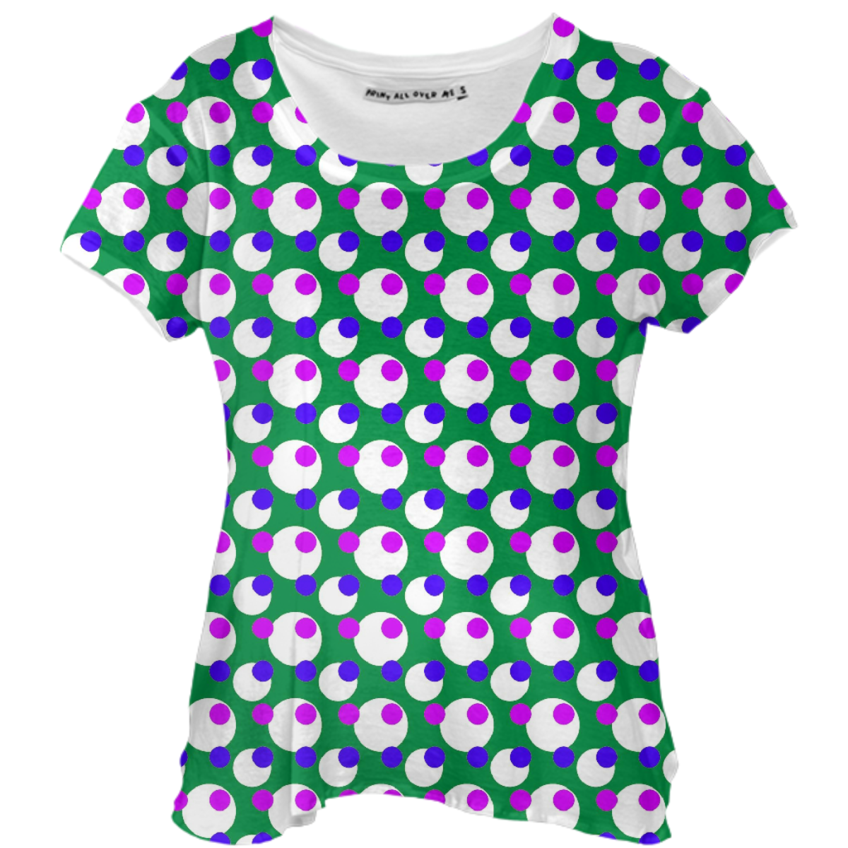 Loose fitting scoop neck shirt with nice drape and curved bottom hem.