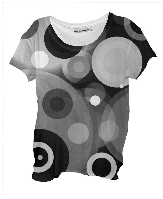 Loose fitting scoop neck shirt with nice drape and curved bottom hem.