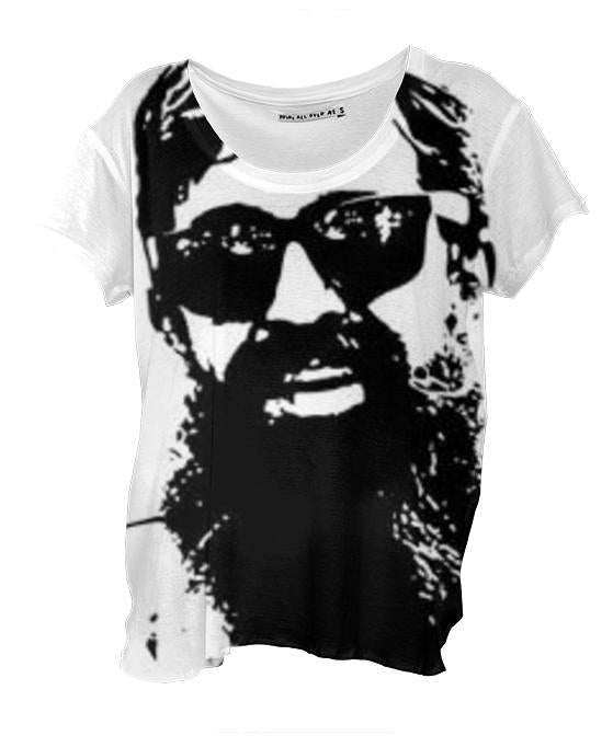 Loose fitting scoop neck shirt with nice drape and curved bottom hem.