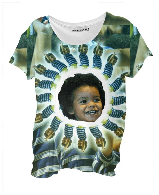 Loose fitting scoop neck shirt with nice drape and curved bottom hem.
